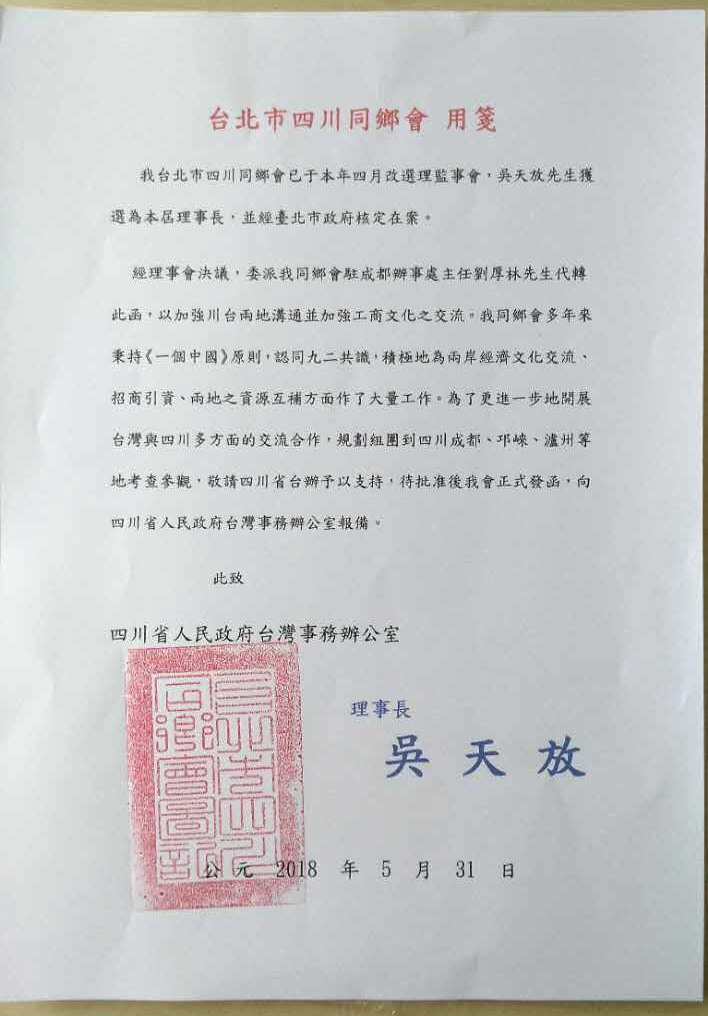 我台北市四川同乡会已于本年四月改选理监事会,吴天放先生获选为本届理事长,并经台北市政府核定在案。