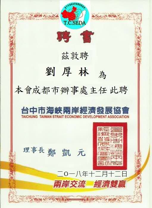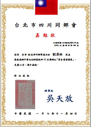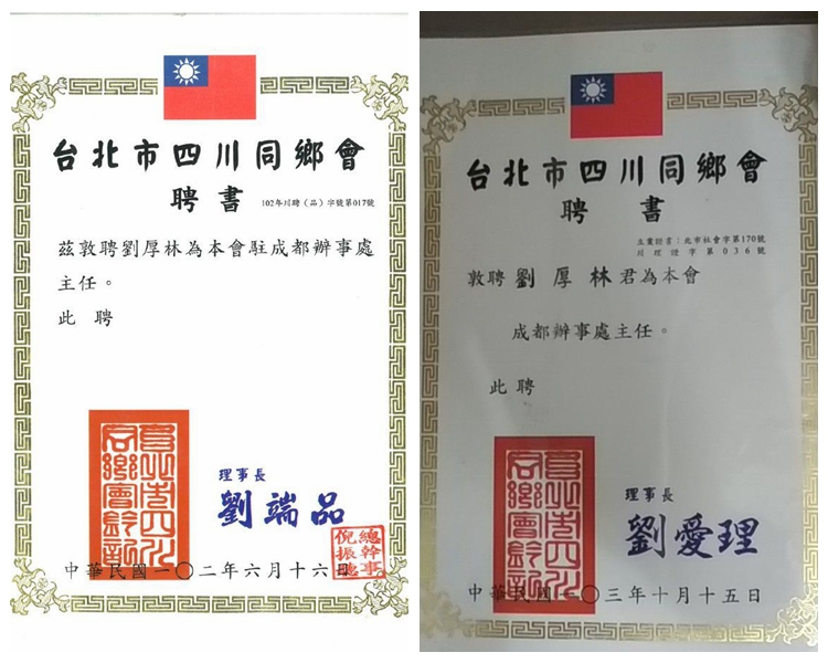 刘厚林:台北市四川同乡会成都办事处主任,多年致力于两岸文化交流。刘厚林先生在2018年11月举办两岸(同台挥毫共襄盛举)话动,独资出版(川台杰出书画名人志)一书。